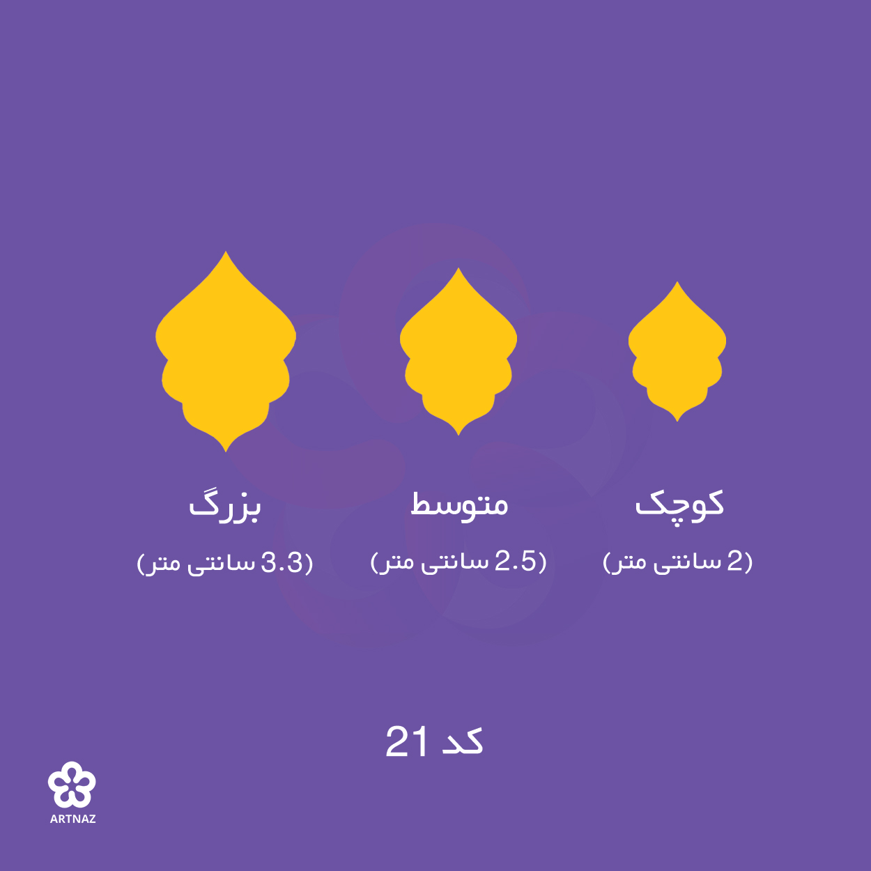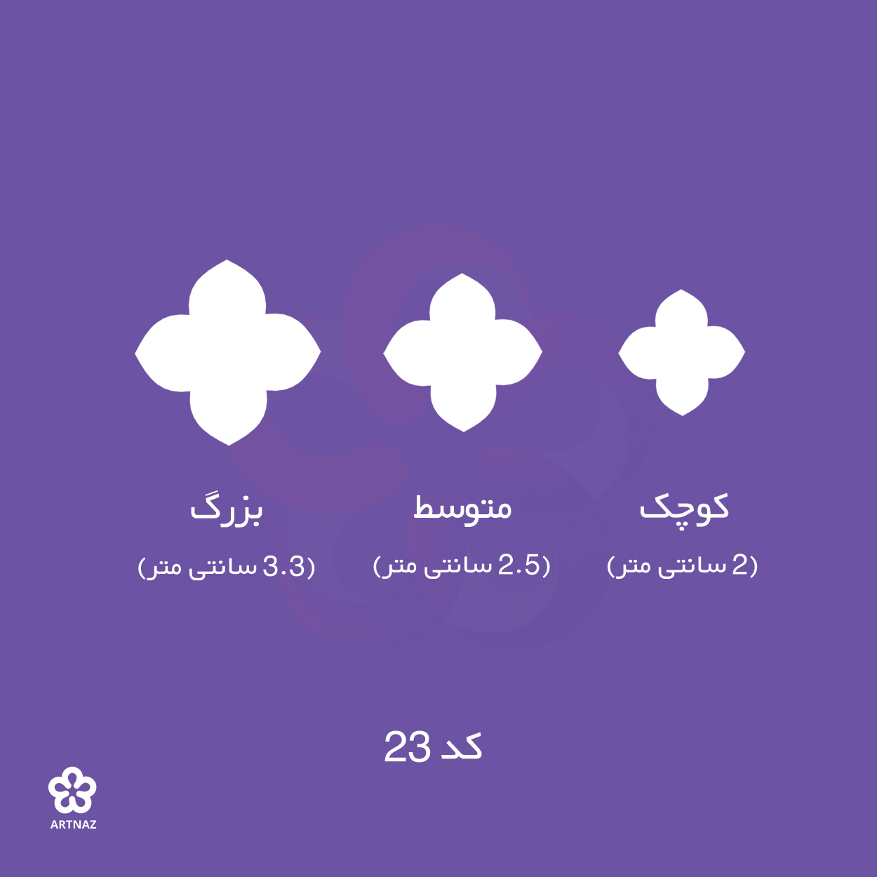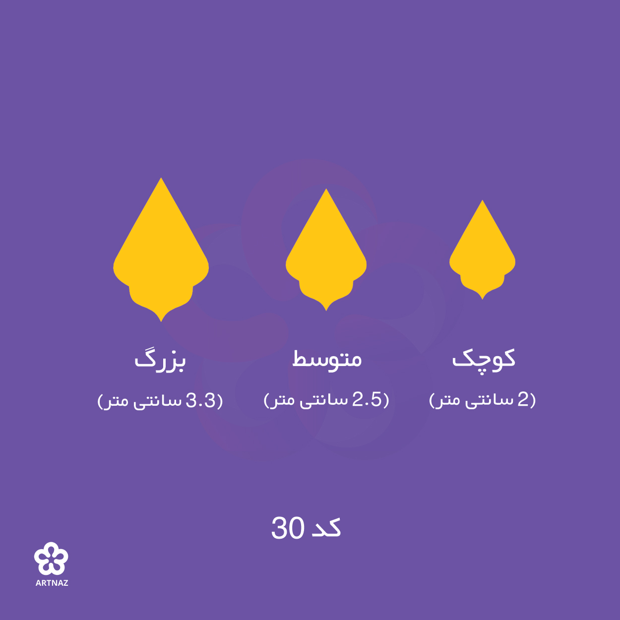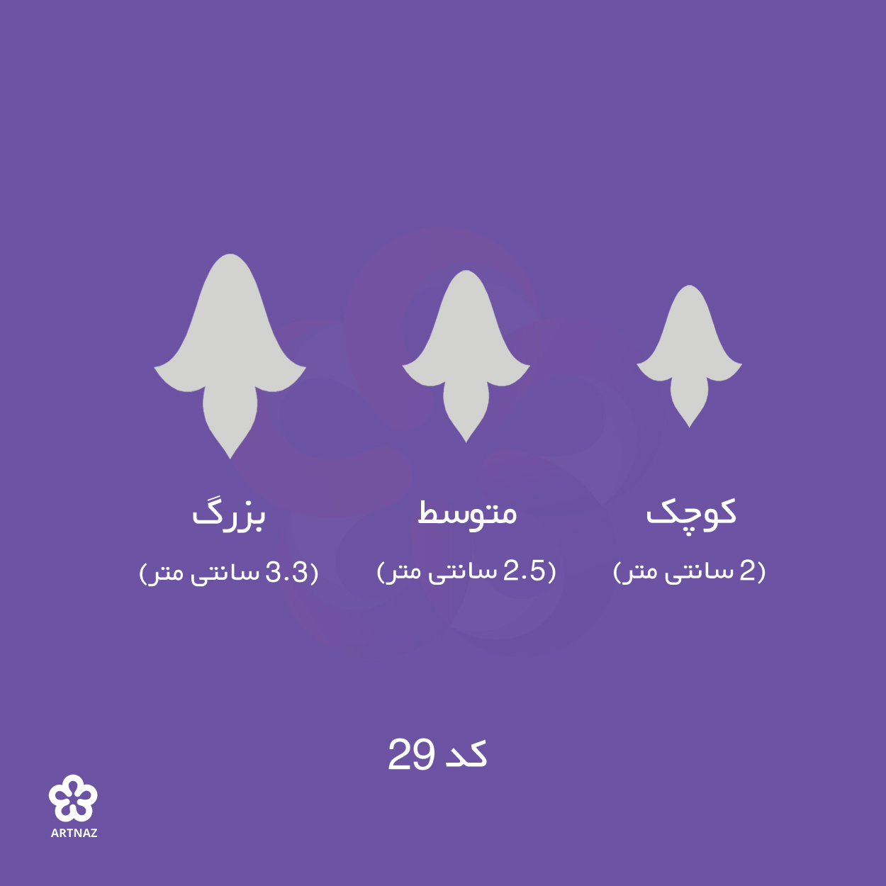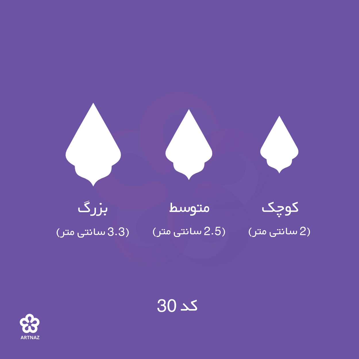 بزرگ: 3.3 سانتی متر, کوچک: 2 سانتی متر, متوسط: 2.5 سانتی متر